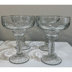 Elevate your drinking experience with this set of four Libbey Yucatan Margarita Glasses. These goblets are made of clear glass with a hammered glass look and a unique shape that is perfect for all occasions. Each glass has a capacity of 13.5 ounces, or 399 milliliters, and comes with an original box.