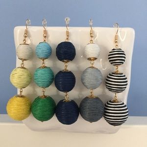 Trendy, lightweight, & 60s inspired, the "Libby" bon bon triple ball drop earrings are ideal for a night out! With their dangling threaded spheres, you're sure to turn heads in these retro oversized statement earrings. Green & sky blue ombre string is wrapped around three balls of increasing size. They have dainty gold colored zinc alloy hooks with rubber backs. New with tags & protective packaging. Available in additional colors in separate listings.