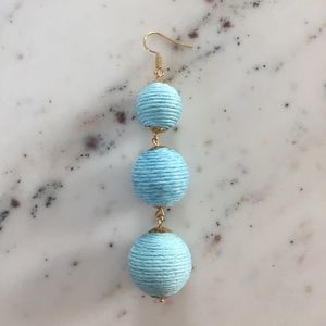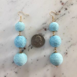 Trendy, lightweight, & 60s inspired, the "Libby" bon bon triple ball drop earrings are ideal for a night out! With their dangling threaded spheres, you're sure to turn heads in these retro oversized statement earrings. Light sky blue string is wrapped around three balls of increasing size. They have dainty gold colored zinc alloy hooks. New with protective packaging. Available in additional colors in separate listings.