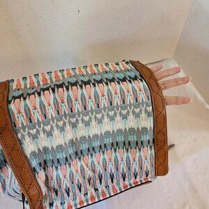 This Libby Edelman Boho shoulder bag has a cute print and a braided leather-like handle. It has an outside pocket and a pass-through pocket with 2 zippered sides outside, and inside there is a zippered pocket and 2 small pockets. I like to reduce-reuse-recycle items when I can. I pass items on when I no longer want them and wish to change things in my wardrobe. I offer this like new and VERY clean bag to you at an affordable price. I hope you enjoy your purchase.