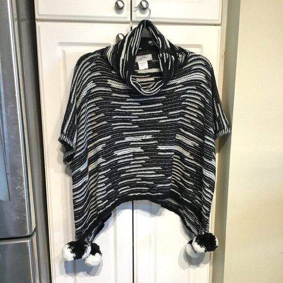 Libby Edelman black & white cowl neck pom-pom poncho. One size. 100% acrylic. GUC.