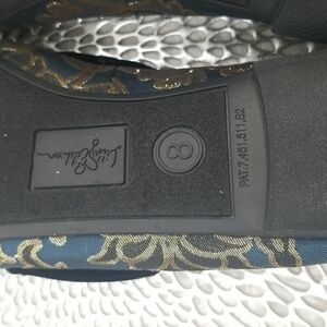 NWOT & Never Worn. Gorgeous Shoe by Libby Edelman of Sam & Libby. Blue & Raised Gold Paisley Print Fabric Upper. Velvet Ribbon Strings Through Gold Grommets Around The Shoe. Beautiful Bow At Almond Toe. This Dressy Flat Shoe Will Take Any Outfit to the Next Level! Perfect for Ladies or Teens Junior Girls. Fits with a Variety of Styles and Colors!