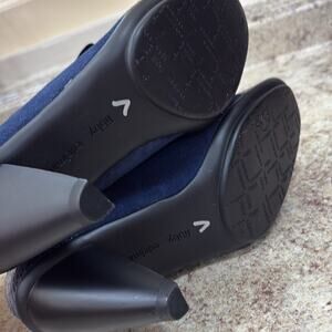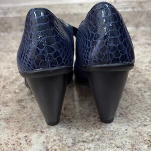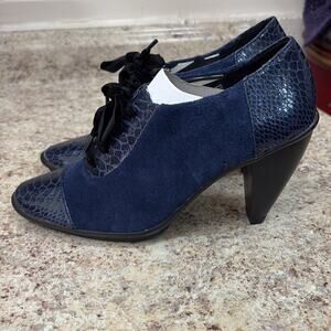 Chic navy heels with black lace-up design. Textured pattern adds flair. Ideal for stylish outings. Velvet shoe strings. 4 inch block heel. Leather and suede leather. NWOT.