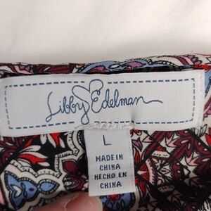 Libby Edelman women's Bohemian large sized top. This top has grommets in the front. There are no laces for the grommets but you could put some in there. The cuffs are elastic. The colors of this shirt are burgundy, red, blue and white