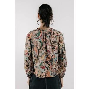 The Libby Top in Liberty’s Paisley Fanfare print is a vibrant blouse with gathered detailing and a tie neckline. Crafted in lightweight fabric with billowy long sleeves, it brings a timeless bohemian elegance to everyday styling.