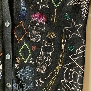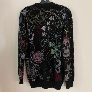 The Libertine Embellished Black Cardigan in size M is a stylish and versatile addition to any woman's wardrobe. Made with a knit fabric, this long sleeve cardigan features a V-neckline and is accented with beaded and rhinestone details, adding a touch of glamour to a casual outfit. The regular fit and classic black color make it a timeless piece that can be worn in the winter, fall, or spring seasons. Crafted in the United States, this cardigan exudes quality and sophistication, perfect for layering over your favorite outfits. It measures 19" from pit to pit and 29" from neck to hem. Excellent condition as shown in the photos. Inner content label removed by prior owner.