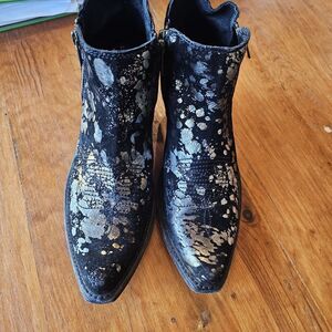 The Liberty Black Size 8 Black Suede Point Toe Heeled Booties are stylish ankle boots with a pointed toe and a mid-height block heel, making them perfect for various occasions including travel, parties, formal events, and work/business wear. The black suede material, accented with a zipper closure, adds a touch of sophistication to the design. These booties are designed for women who appreciate both fashion and functionality, with a theme that combines elements of cowboy, metal, and cowgirl styles. Made in Mexico, these versatile boots are ideal for the winter, fall, and spring seasons. Pre-owned
