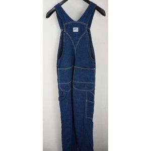 Classic blue denim overalls. Features bold white text on leg. Green button accents. Adjustable straps for comfort.