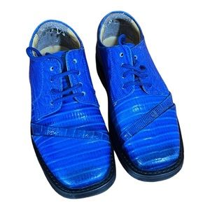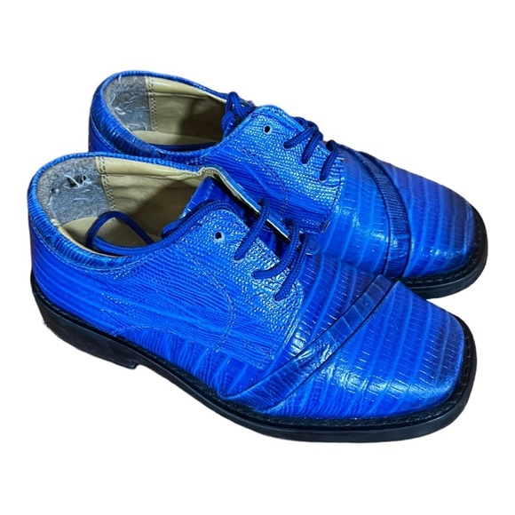 Experience elegance with Liberty's dress shoes, featuring a striking blue and black color combination. These shoes boast a classic cap-toe design with a textured, glossy finish that catches the light beautifully. Perfect for formal occasions, they offer a comfortable fit with traditional lacing and a durable black sole.