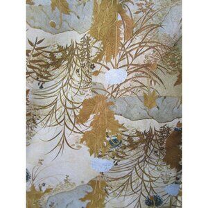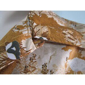 Vintage 1970's Liberty House of Hawaii men's disco shirt. Features a brown, tan, and silver tone foliage design with faux wood topped button. Short sleeved and made from polyester. The top loop button may have been replaced. Size is XL.