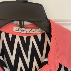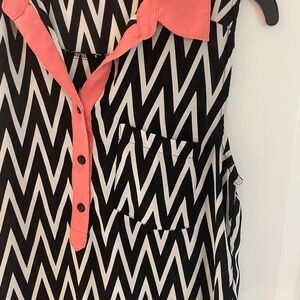 Chic sleeveless blouse with bold chevron design. Features pink trim and buttons. Ideal for modern style.
