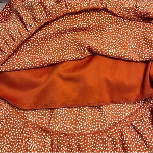 Excellent pre owned condition with no flaws! Strap top off the shoulder ruffle dress. Elastic waist and ruffle hem. skirt is lined. Burnt Orange with white polka dots.