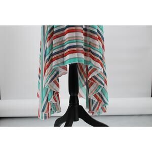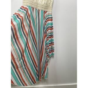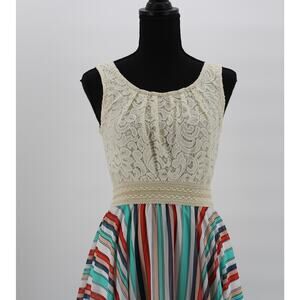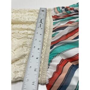 Cream Lace Bodice. From the waist down, flowing fabric that is multicolor stripes.
