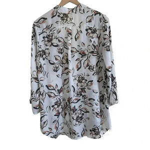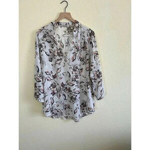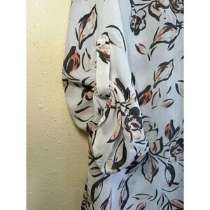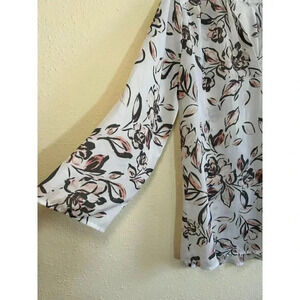 Liberty Love Women's White Top with Floral Design Size XL. This romantic, flowy top skims over the body and has a V-neck. It is a sheer top that has a lower scoop in the back. Blending casualness with elegance. White sheer top with pink and greige flower design with 3/4 length sleeves with roll tab that can be worn rolled up and buttoned in place or down.