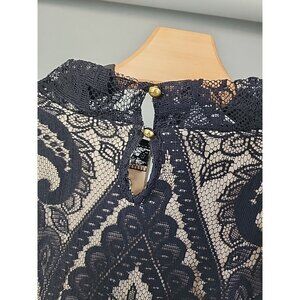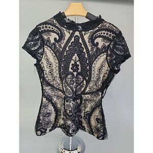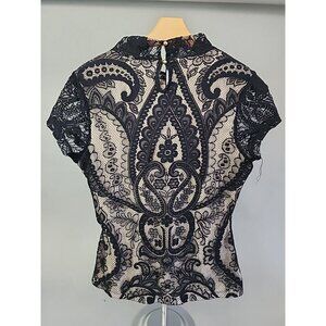 Liberty Love Top Size L black lace with beige underlay high neck cap sleeve y2k