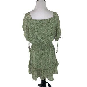 Liberty Love Women's Mini Dress in Junior Size XL. New with Tags. Cinched Waist, short sleeves with ties. Ruffled Hemline. Chiffon Layer with floral print over solid green lining. Great condition, no flaws.