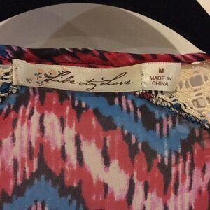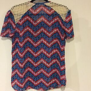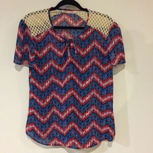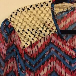 Get ready for warm weather with this short sleeve semi sheer top. Love the crochet inserts on top of the shoulders!