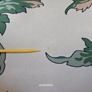Appears to be a newer scarf with some minor issues. There are a few spots of what look like water stains (like, you can see the faint outline of where a clear liquid was on the scarf). There is also a small mark (pictured with toothpick). A dry cleaning would probably have this scarf looking like new.