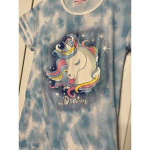 A blue tie dye girls' night gown featuring a unicorn dream graphic. Size M 10/12, perfect for a comfy bedtime.