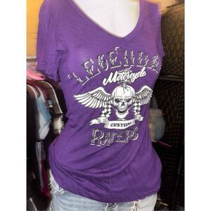 *Purple V-Neck T-Shirt with Motorcycle Skull Graphic*