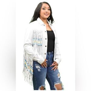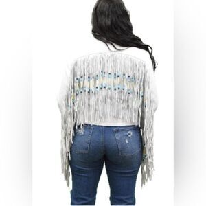 Get ready to turn heads in our show-stopping leather jacket, adorned with vibrant bead embellishments and flowing fringe that's sure to make you feel like a rockstar. The perfect blend of edgy and elegant, this jacket is ready to take your style to the next level. Pair it with your favorite distressed denim and a bold attitude for a look that’s guaranteed to make a statement.