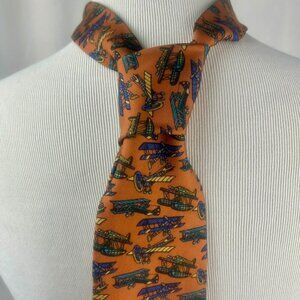 Liberty of London Airplane Neck Tie Men Orange Rust Blue Silk Pilot Flight Plane