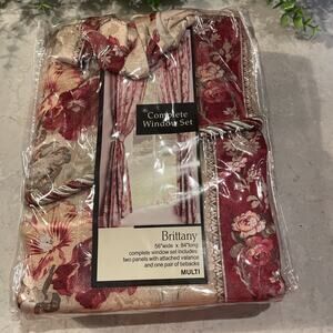 The Lichtenberg Brittany Floral One Complete Window Set is a vintage-inspired curtain set featuring a beautiful floral pattern in gold and red hues. Made from a polyester cotton blend, this oriental-style curtain set includes a rod pocket heading for easy installation. Measuring 56x84", this window set is perfect for adding a touch of elegance to any room in your home. Made by S. L. Home Fashions 2008 New old stock
