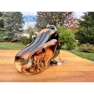 Beautiful Licio Zanetti Murano Art Glass Frog Sculpture, hand crafted in Italy. This elegant piece features a smooth, fluid design with rich amber-to-clear tones that beautifully capture and reflect light. A stunning example of Murano artistry and craftsmanship.