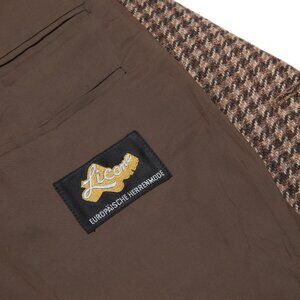 ...The vintage double-breasted houndstooth blazer by Licona is a quintessential representation of mid-to-late 20th-century European menswear tailoring. Featuring a structured silhouette, bold lapels, and a premium wool blend, it embodies the era’s commitment to craftsmanship and longevity. The label “Europäische Herrenmode” indicates a strong focus on sophisticated European menswear, emphasizing precise tailoring and classic aesthetics rooted in both British and German sartorial traditions. While Licona is not a globally recognized heritage brand, its execution aligns with the robust tradition of German and Austrian tailoring, which often borrows from British influences while maintaining distinct European precision. The structured cut, fabric choice, and double-breasted front closure position this blazer within the framework of high-quality mid-century European tailoring. The blazer’s design follows a traditional six-button, double-breasted front closure, reinforcing a structured, authoritative style that aligns with classic menswear. The notched lapels are wider than contemporary standards, accentuating a bold vintage silhouette that draws from power dressing aesthetics of the late 20th century. The brown and beige houndstooth pattern evokes traditional British countryside tailoring, yet the fit and proportions lean toward European sartorial sensibilities.