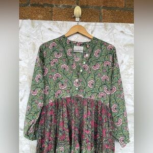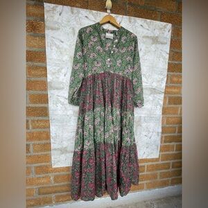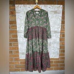 Lido Boho Maxi Dress Green Pink Floral Button Front Tiered Long Sleeve medium