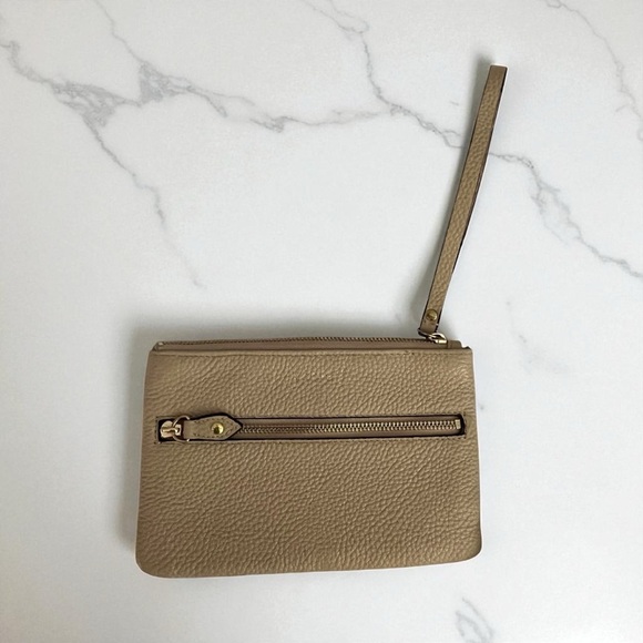 Chic and versatile Lodis wristlet in a neutral taupe pebbled leather with gold-tone hardware. Features a front zip pocket for easy access to essentials and a secure top zip closure. Perfect for day-to-night use or keeping your essentials organized inside a larger bag.