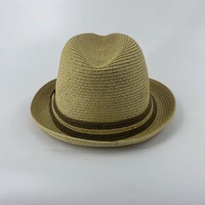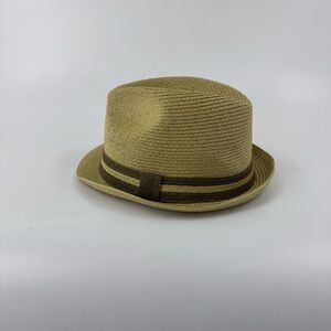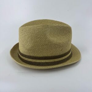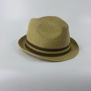 Stylish tan fedora with brown accent band. Perfect for casual wear.