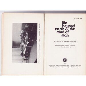 Rare vintage NASA publication: "Life Beyond Earth & The Mind of Man," edited by Richard Berendzen. First edition, published 1973 (NASA SP-328), documenting a renowned Boston University symposium on the possibilities of extraterrestrial life and the human mind’s quest for meaning in the universe. Contributors include Carl Sagan, George Wald, and Ashley Montagu.