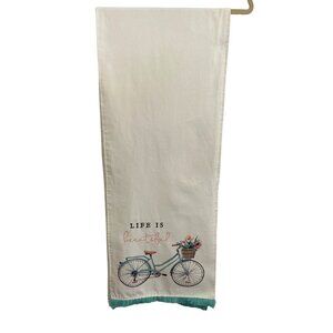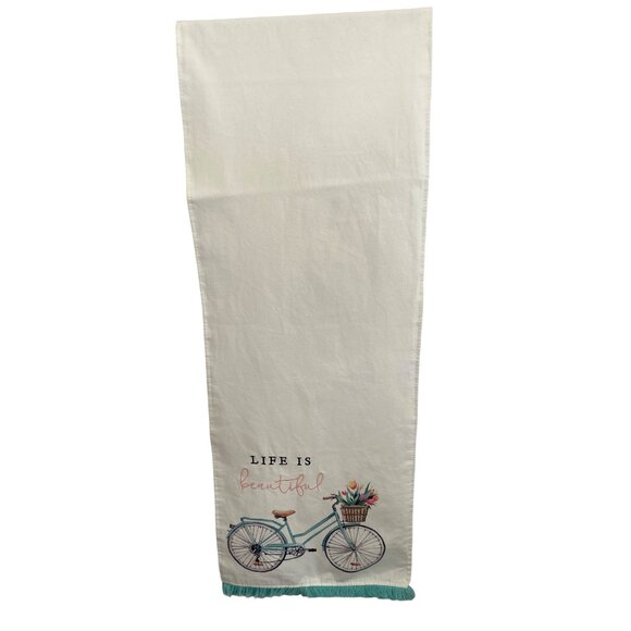 Add a touch of charm to your dining table with this delightful table runner. Its whimsical bicycle design and motivational message bring a sense of joy and freshness to any meal setting. Runner has the same bike pattern on both ends. In great condition.