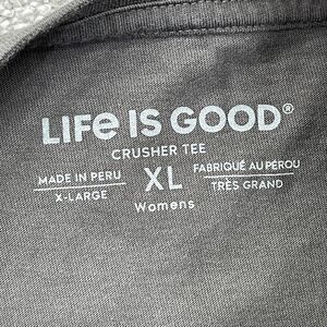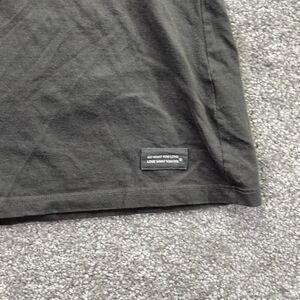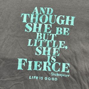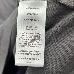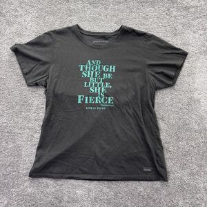 Short sleeve black tee. Green text design on front. Comfortable and casual.