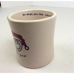Good Home by Life Is Good coffee mug. Smiling face with Santa hat graphic; "Life is Good" printed underneath. "Do what you like. Like what you do." printed along inside rim. Pre-owned. See photos for details and measurements taken.