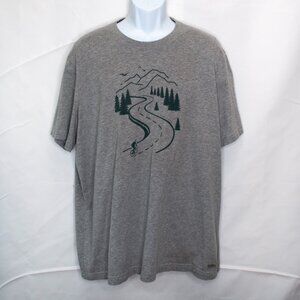 Crusher Tee featuring a biking scene through the mountains graphic from Life is Good in a men's size XL. Heather gray and green. Gently used.