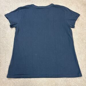 Navy blue tee with cat graphic on front that says "Every snack you make Every meal you bake Every bite you take I'll be watching you" on the front. Good preworn condition, size large.
