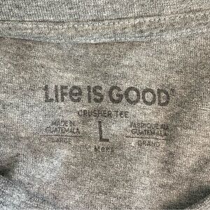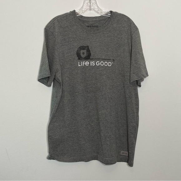 Life Is Good Grey Tape Measure Crusher Tee. Men's grey t-shirt with tape measure graphic on front, circular graphic on back with phrase "Those who say it cannot be done shouldn't interrupt the people doing it" and power tools in center. New without tags.