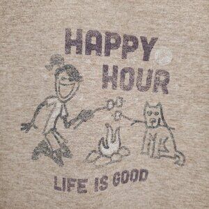 Life Is Good "Happy Hour" Camping-Themed Long Sleeve Crusher Tee M Tan, good used condition with a minor pinhole repair from tag at shoulder as shown.