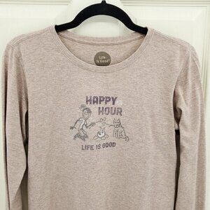 Life Is Good "Happy Hour" Camping-Themed Long Sleeve Crusher Tee M Tan