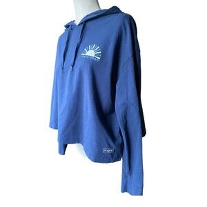 Stay cozy in this Life Is Good Crusher-Flex Boxy Hoodie, size Large, in Darkest Blue with a sunset-on-water graphic. Features a slightly cropped, oversized fit, soft midweight jersey (92% USA-grown cotton, 8% spandex), and garment-washed finish. Details include braided drawcord hood, self-fabric cuffs, side vents, and signature Life Is Good locker patch. Excellent pre-owned condition. Measurements provided in photos. Perfect for layering, lounging, or spontaneous outdoor adventures.