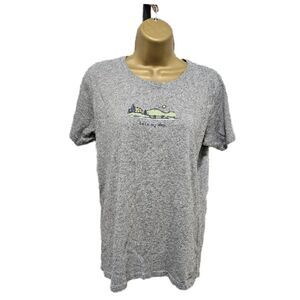 The Life Is Good LAKE MY DAY Granola Nature Boat Cabin Hiking Tee Shirt for women in size medium is a comfortable and versatile top for casual occasions. Made from a cotton blend knit fabric in a solid gray color, this short sleeve shirt features a crew neck and pullover closure. The shirt is machine washable and perfect for all seasons, with a tagless design for added comfort. With a regular fit and basic style, this tee is ideal for adventures in nature, whether it's hiking or simply enjoying a day outside.
