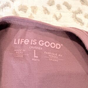 The Life Is Good Men's Long Sleeve Crusher T-Shirt in Mauve with the "ROCK ON" theme is a stylish and comfortable addition to any man's wardrobe. Made from breathable cotton knit fabric, this shirt is machine washable and perfect for all seasons. The graphic print features the iconic Life is Good logo and aligns with themes of outdoors, off-roading, and Jeeps. With a regular fit and size Large, this T-shirt is ideal for everyday wear and showcasing your unique style. Shirt is in excellent, pre-loved condition!