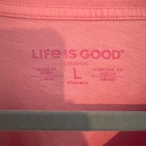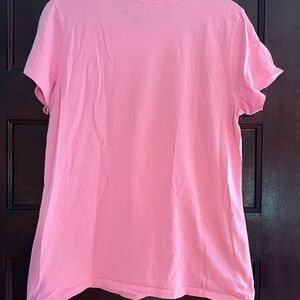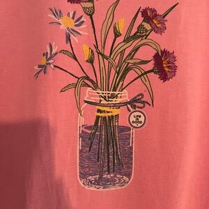 Pink tee with floral jar graphic. Comfortable short sleeves. Casual style.