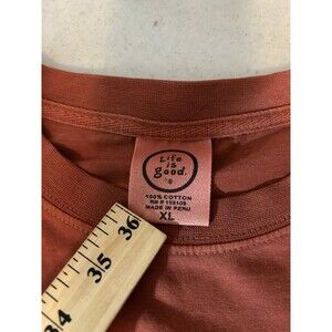 This Life Is Good T Shirt for men in XL size features a Santa Golfer design, perfect for the winter, fall, and spring seasons. The shirt is made from 100% cotton knit fabric, making it comfortable and breathable. The rust color adds a unique touch to the classic look of the shirt, which is suitable for casual occasions and easy to care for with machine washable instructions. The long sleeves and crew neckline make it a versatile option for outdoor activities or everyday wear. The brand's logo accents add a personalized touch to this stylish and fun tee.