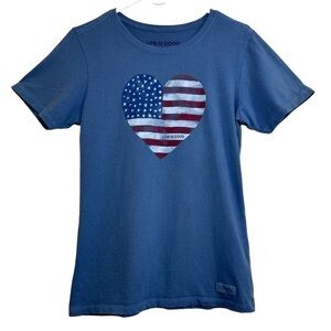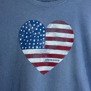 Tags: Life is Good, patriotic tee, heart flag shirt, USA shirt, Americana, womenβs XS, blue T-shirt, soft cotton, crew neck, short sleeve, summer outfit, July 4th, Independence Day, patriotic fashion, casual style, comfort wear, minimalist, classic fit, coastal casual, weekend wear, flag heart graphic, positive vibes, cute tee, everyday style, versatile top