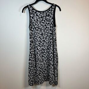 Life is Good Microfloral Tank Dress Black White Floral Pullover Sleeveless A-Line Round Neck Hand Pockets Stretch Knee Length Lightweight Summer Vacation Beach Resort Cottage Boho Outdoor