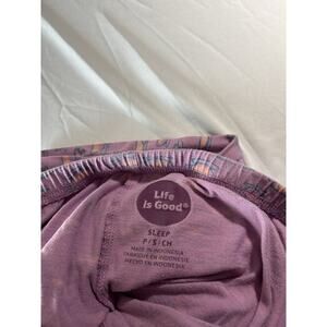 This Life Is Good Women's Pajama Set in size S features a cozy design with a coffee cups pattern on a pink background. Made of lightweight polyester knit fabric, this set includes a long-sleeve top with a button-down neckline and a drawstring closure for a comfortable fit. Perfect for winter, this pajama set is machine washable and bears the Life is Good logo accent, making it a stylish and comfortable choice for lounging around the house.