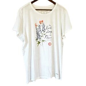 Life Is Good Women's XL Crusher Tee The Earth Laughs in Flowers "Ralph Waldo Emerson" White Short Sleeve Crew Neck Tee with Short Sleeves Excellent Condition Casual Comfortable Cotton Made in Peru Lightweight Breathable Do What You Love, Love What You Do Beachy Spring Break Travel Vacay Vacation Summer Spring Flowers